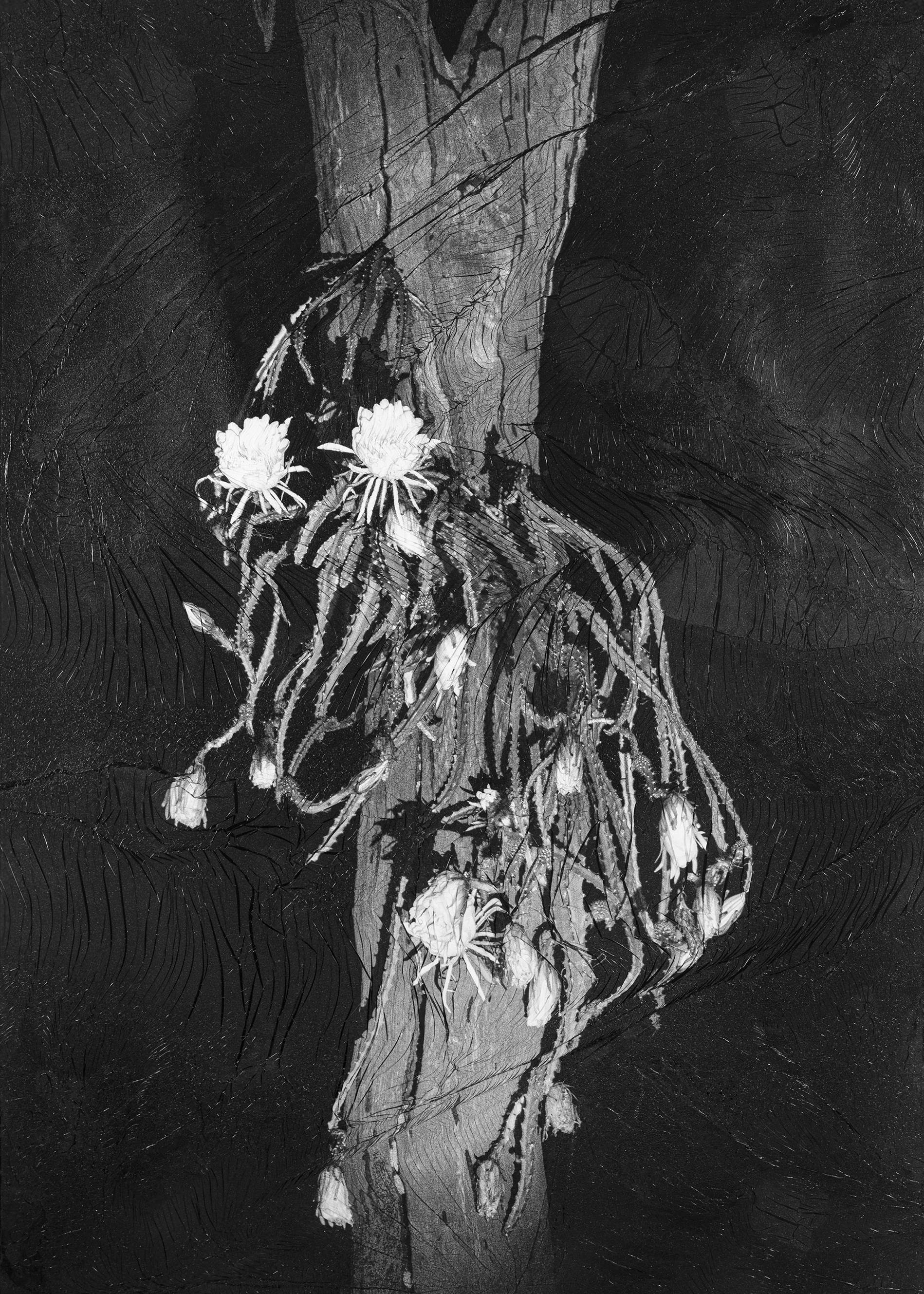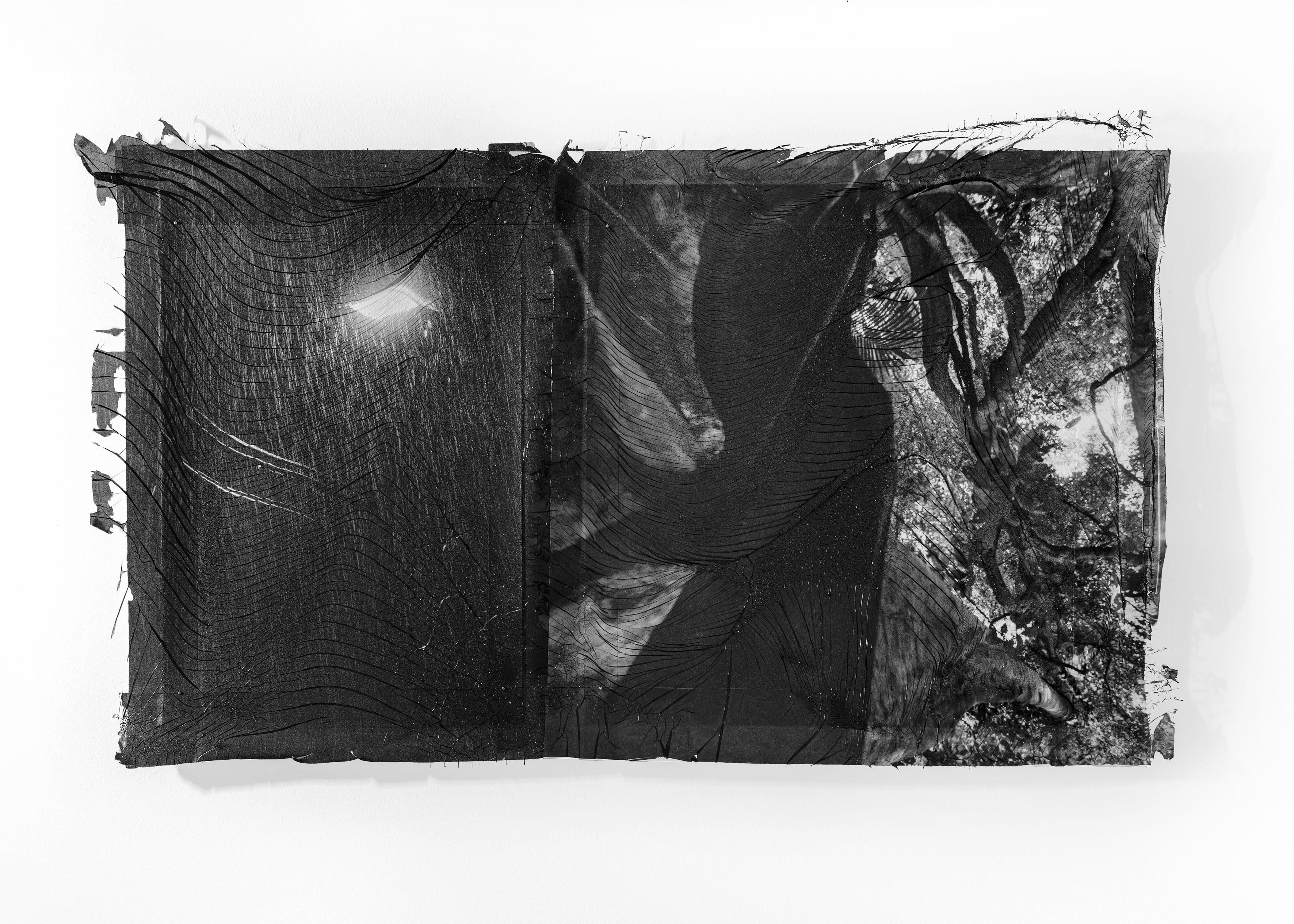 Diptyque, photographies NB, gélatines argentiques transposées et cristallisées sur papier Fabriano, 36 x 56 cm. Oeuvres uniques.